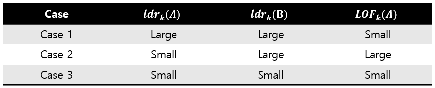 - Case 2 : 반대로 A가 밀도가 높지 않은(sparse area) 지역에 위치한다면 분모가 커지게 되고 이에 따라 $lrd_k(A)$값도 작아지게 됩니다.