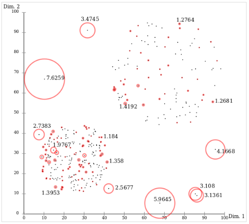 LOF의 장점으로는, 굉장히 밀집된 클러스터에서 조금만 떨어져 있어도 이상치로 탐지해준다는 점입니다. 아래 그림에서 숫자들이 LOF 스코어를 나타내고 있습니다. 굉장히 뺵빽한 곳에 가까운 이상치들은 확실히 더 높은 LOF값을 가지는 것을 확인할 수 있습니다.