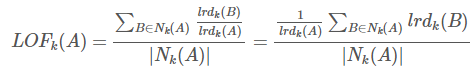 위 식에서 분자를 보면 A에 속한 B의 local reachability density의 평균을 $|N_k|$로 나눴다는것을 확인할 수 있습니다. 여기서 산출된 LOF score는 결국 A가 얼마나 이상치인가를 나타내는 정도라고 볼 수 있습니다.