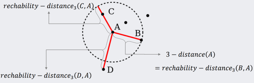 위 그림에서도 A를 기준으로 봤을 때, B와 C까지의 reachability-distance는 원 밖으로 밀어내서 3-distance(A)와 같아집니다. 그리고 D의 경우는 원 밖에 있으니까 그대로 거리값을 사용하게 됩니다.