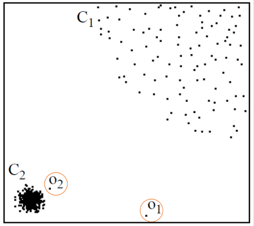 위 그림에서 O1은 이상치라는걸 바로 알 수 있지만 O2는 이상치라고 말할 수 있을까요? 얼핏 보기엔 아닌 것 같지만 근처에 빡빡하게 밀집해 있는 데이터가 있으므로 이상치라고 볼 수도 있을 것입니다. LOF(Local outlier factors)관점에서는 O2도 이상치입니다. 밀집 지역에서 밀도 관점으로 봤을 때 급격한 감소가 이루어지기 때문입니다. 즉, LOF는 데이터가 가지는 상대적인 밀도까지 고려한 이상치 탐지 기법입니다.