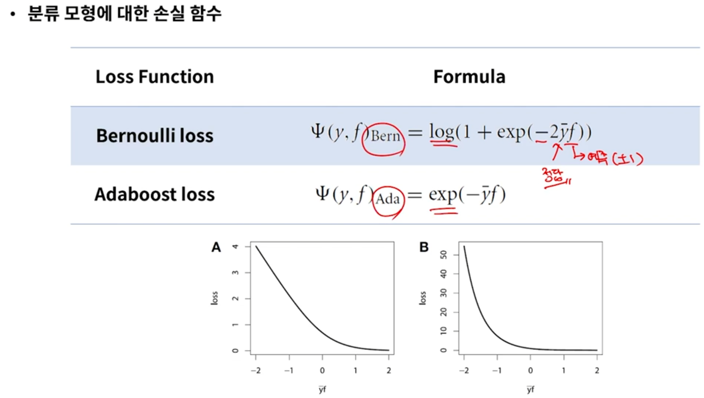- 베르누이 loss는 adaptive loss 보다 log 값이기 때문에 더 작다. 그래서 adaptive loss가 오분류에 더 민감하게 반응하는 특징이 있다.
