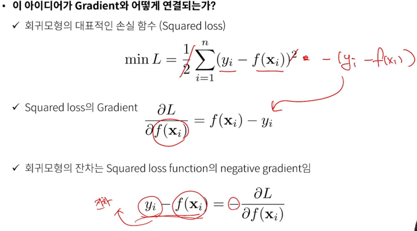 - 실제값에서 함수값을 뺀 잔차를 활용하는 것이 negative gradient를 활용하는 것과 같아지는 것이다.