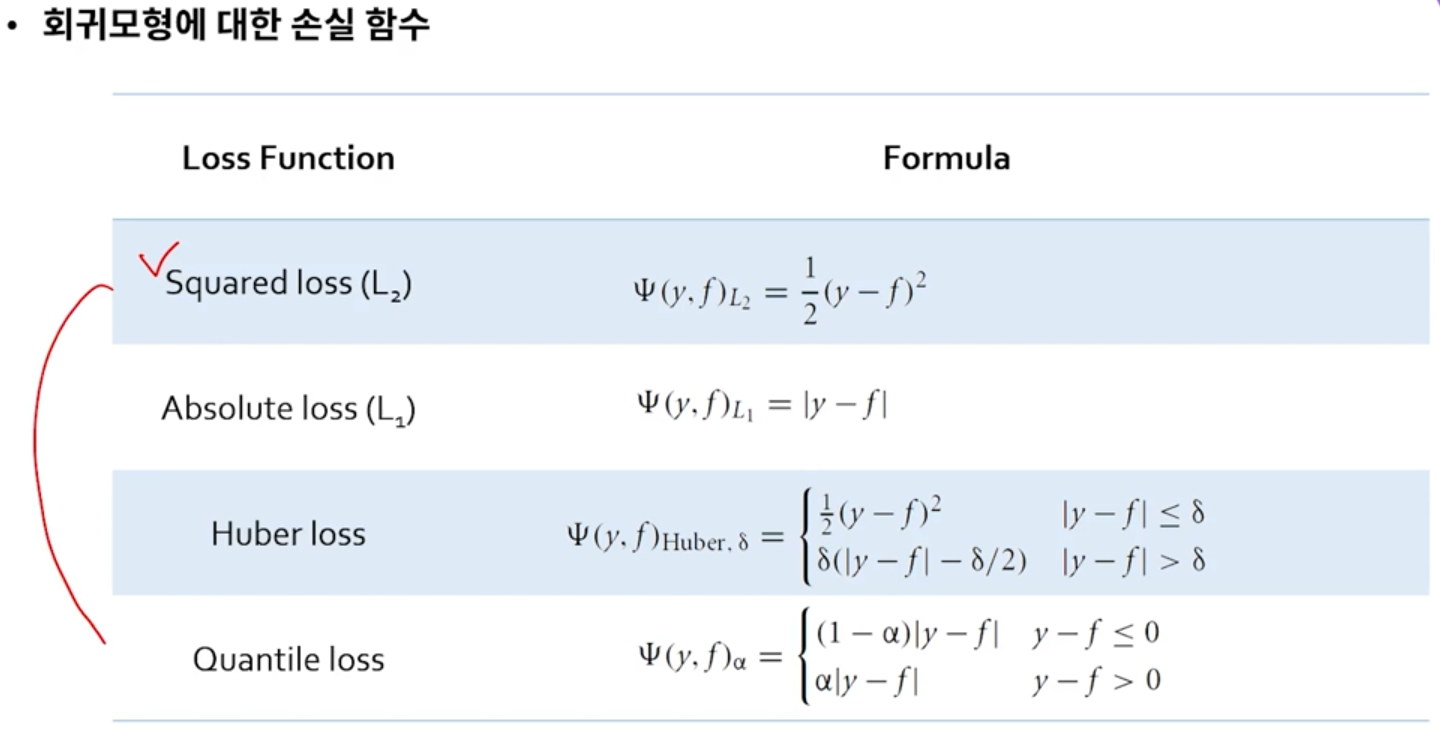 - 회귀모형의 경우 이렇게 네 가지 loss가 가장 많이 사용된다.