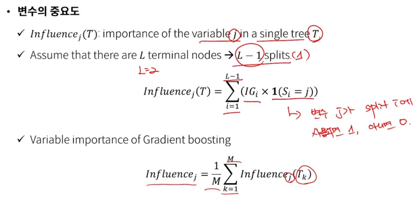 - Influence_j : 모든 tree에 대한 j번째 변수에 대한 중요도를 더해서 평균내서 변수 최종 변수 중요도 계산한다.