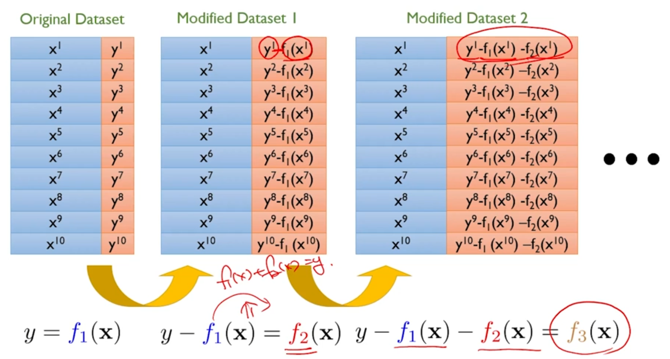 - 만약 틀린 것 만큼, 즉 y-f1(x)를 목적으로 하는 f2(x) 모델을 만든다는 것은 노이즈도 학습하겠다는 것이다.