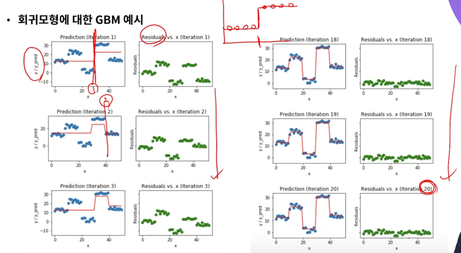 - Adaboost는 못 맞추는 객체의 선택 확률값을 조정해서, 즉 선택 확률 분포를 조정했는데, GBM은 y값을 조정해서 맞추어야 하는 값이 무엇인지를 정해주자, 그렇게 guide 해주자는게 GBM.