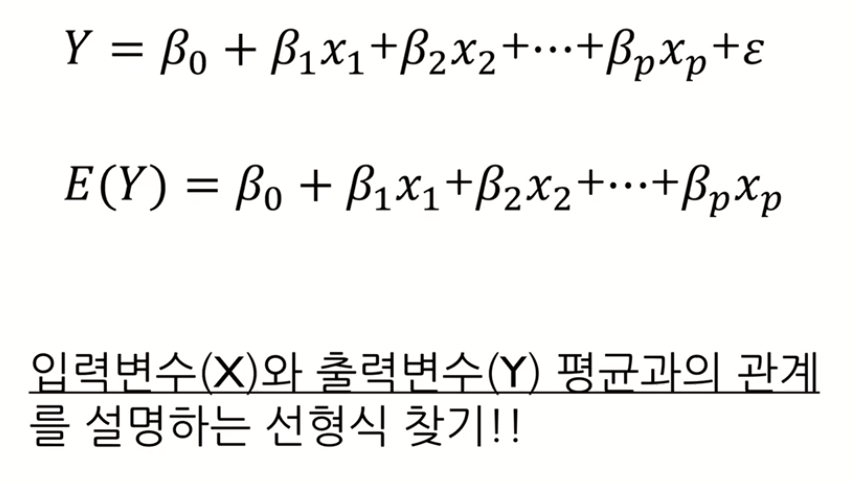 - 선형회귀모델 : 출력변수 Y를 입력변수 X들의 선형결합으로 표현한 모델