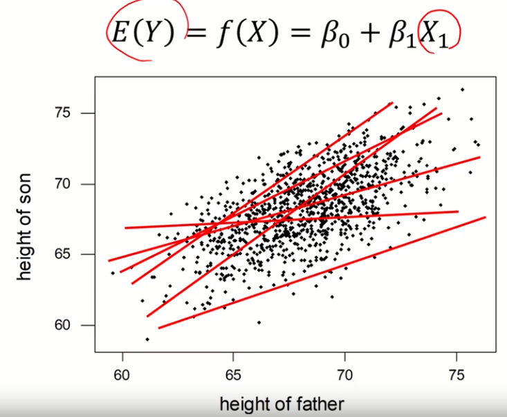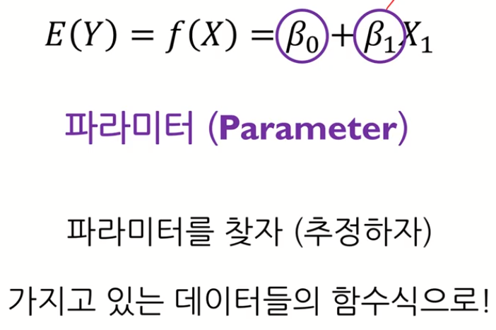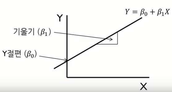 - X변수 한 개가 Y를 표현하는 경우 : $Y=\beta_{0}+\beta_{1}X$ (직선식)