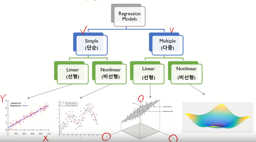X 변수의 수, X변수와 Y변수의 관계의 선형성 여부에 따라 구분