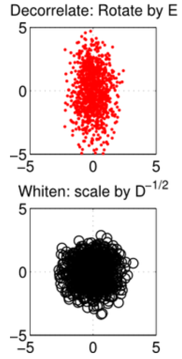 첫째, eigenvector matrix $E^{T}$(covariance로부터 계산됨) 를 곱함으로써 data를 decorrelate시킨다. 이 decorrelation 과정은 데이터의 principal axes가 가장 분산이 큰 axes와 align될 수 있도록 회전시킨다. 이 과정은 PCA에서 수행하는 것과 같은 과정이다.