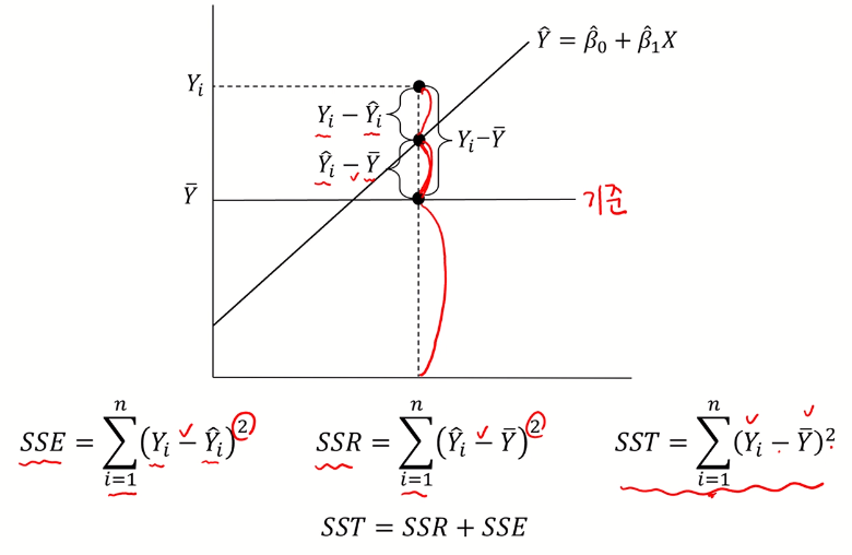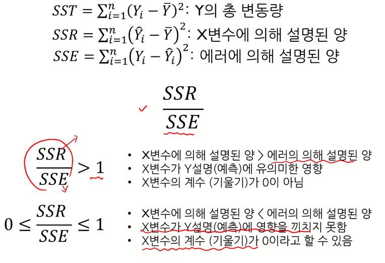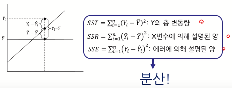 - 분산 정보를 이용하여 분석 (SST, SSR, SSE 모두 편차 제곱의 평균 처럼 분산이라고 할 수 있음)