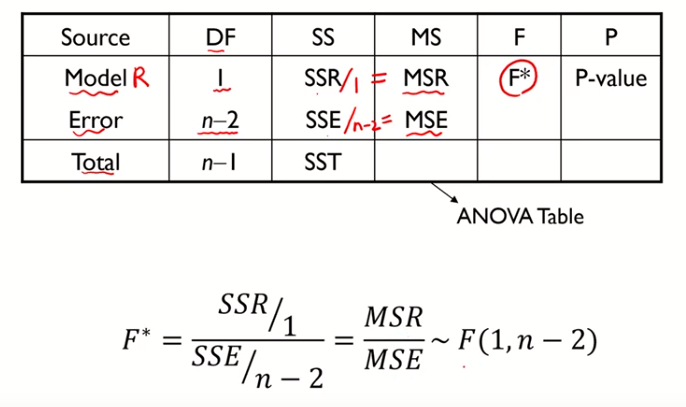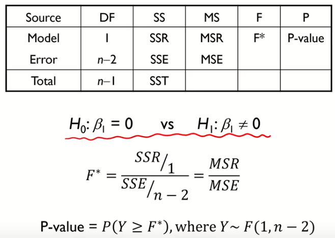 - P-value가 0과 가까우면, $F^{*}$ 값이 큰 것이고, 그러면 $\beta_{1}=0$ 이라는 귀무가설 기각한다.