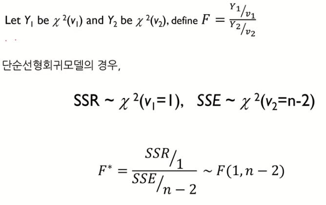 - 하지만, SSR과 SSE가 각각 카이제곱 분포 (파라미터 : 자유도)를 따름
