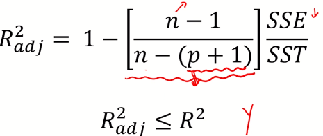- 수정 $R^{2}$는 앞에 특정 계수를 곱해 줌으로써(보정) 유의하지 않은 변수가 추가될 경우 증가하지 않게 함