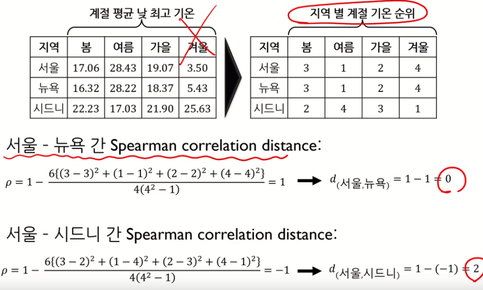 - ρ 를 Spearman correlation 이라 하며, 이는 데이터의 rank를 이용하여 correlation distance를 계산하는 방식임
