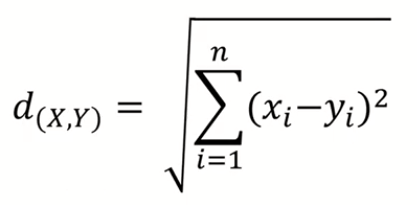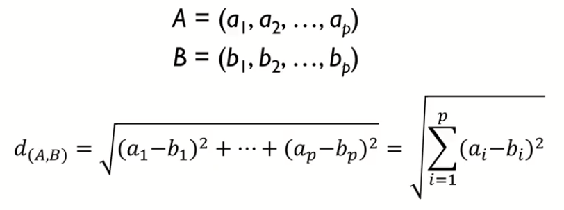 - 대응되는 X, Y값 간 차이 제곱합의 제곱근으로써, 두 관측치 사이의 직선 거리를 의미함