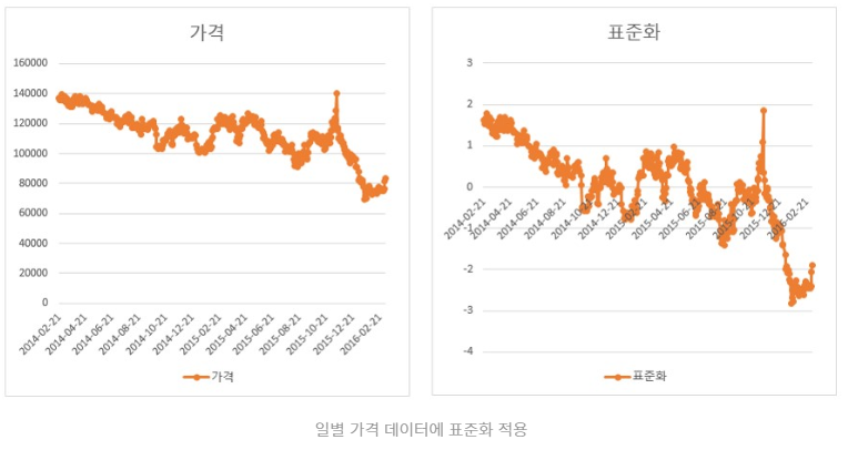- 예를 들어, 삼성전자와 현대차의 주식시세에 대해 동일 기간에 대해 표준화를 수행하면 두 종목이 어떤 특징을 가지고 움직이는지 관찰하는데 도움이 됩니다.